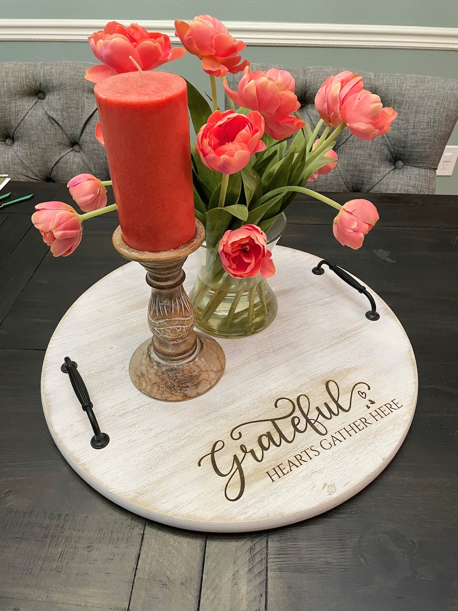 Add a touch of rustic charm and personal elegance to your home with this 20x20 Whitewash Round Wood Tray. Featuring a beautifully weathered whitewashed finish and two matte black handles, this circular tray is both stylish and practical. Its rounded edge design makes it perfect for displaying decor, serving guests, or creating a one-of-a-kind coffee table centerpiece. Each tray is beautifully engraved to add a special, personal touch — whether it’s a family name, meaningful quote, or memorable date. Elevate your space with a piece that’s as functional as it is unique!