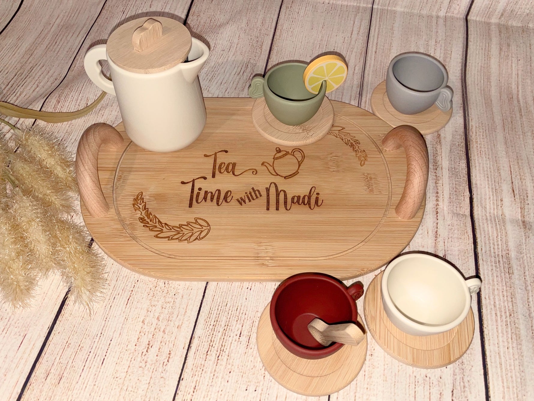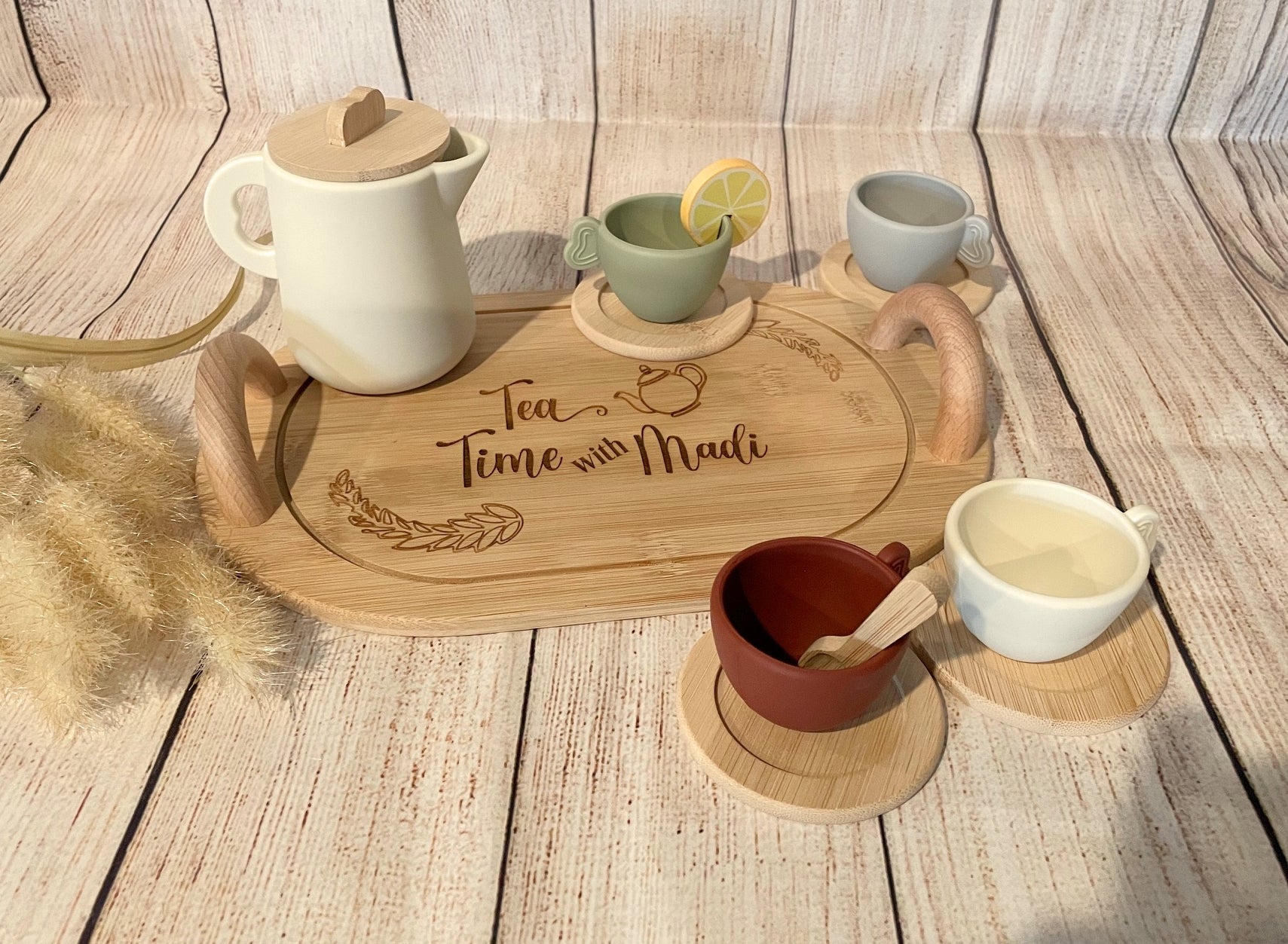 The wooden tea set for kids features a personalized touch with a wooden tea tray laser engraved with "Tea Time with (your child's name). Also included in the set is a silicone teapot, & teacups, wooden spoons & coasters. Constructed from safe, non-toxic materials, this high-quality toy promotes imaginative play and helps develop essential skills like shape recognition and hand-eye coordination. It's the perfect gift for children aged 3 and up, whether for back-to-school, birthdays, or other special occasions
